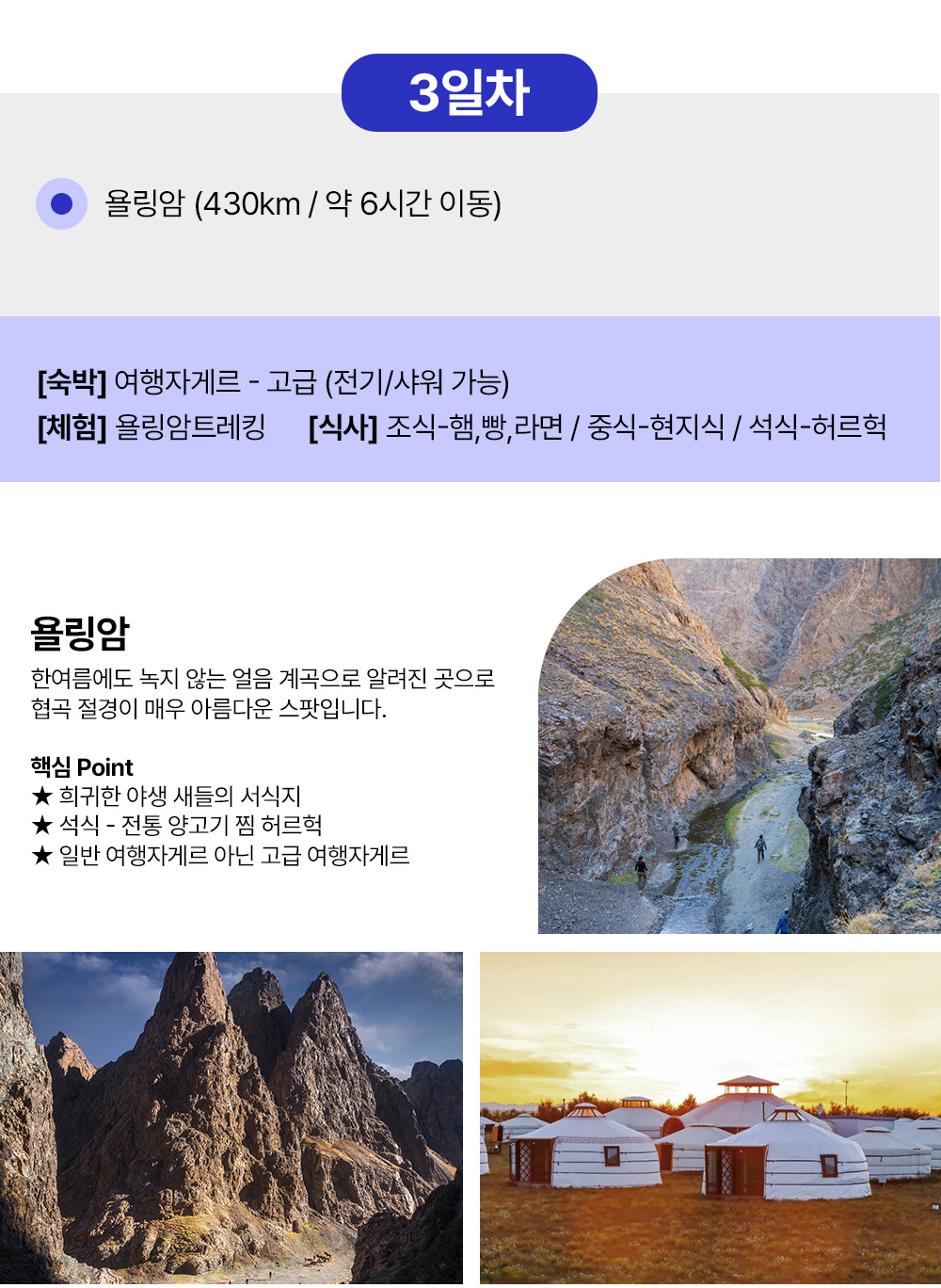 [3day] 욜링암 독수리 계곡, 전통 양고기찜 허르헉 (여행자게르-고급)