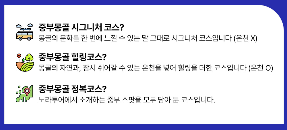 몽골의 문화를 한 번에 느낄 수 있는 말 그대로 '시그니처 기본 코스입니다. 토탈 투어비용에서 실제 결제는 예약금(1인 5만원)만 진행합니다. 잔금은 현지에서 '한화'로 지불해주세요.