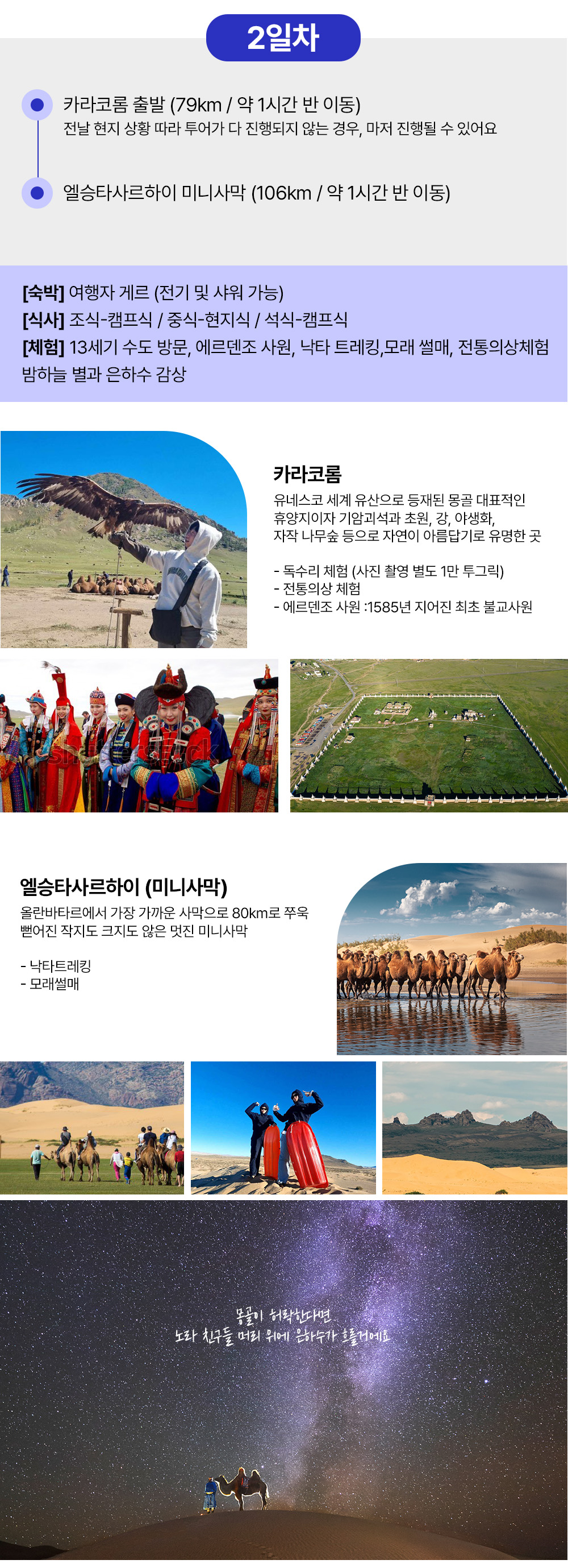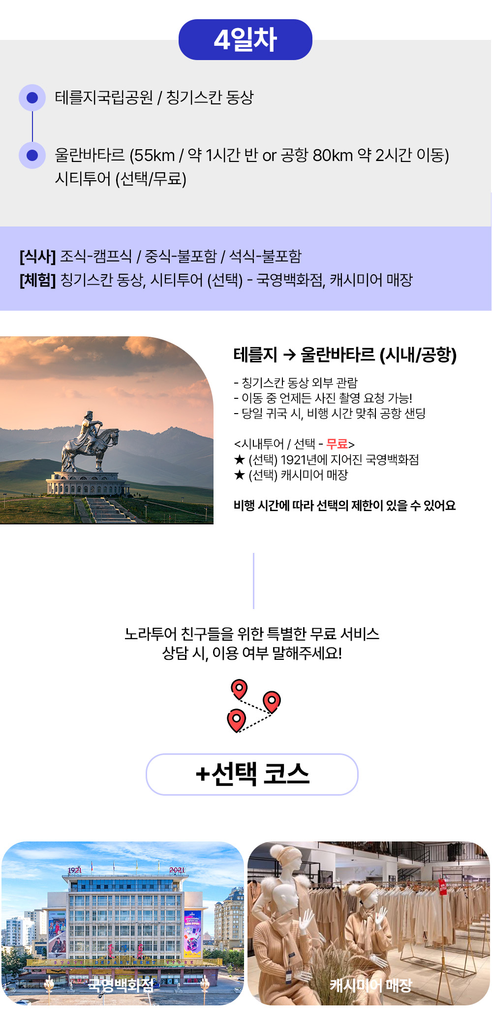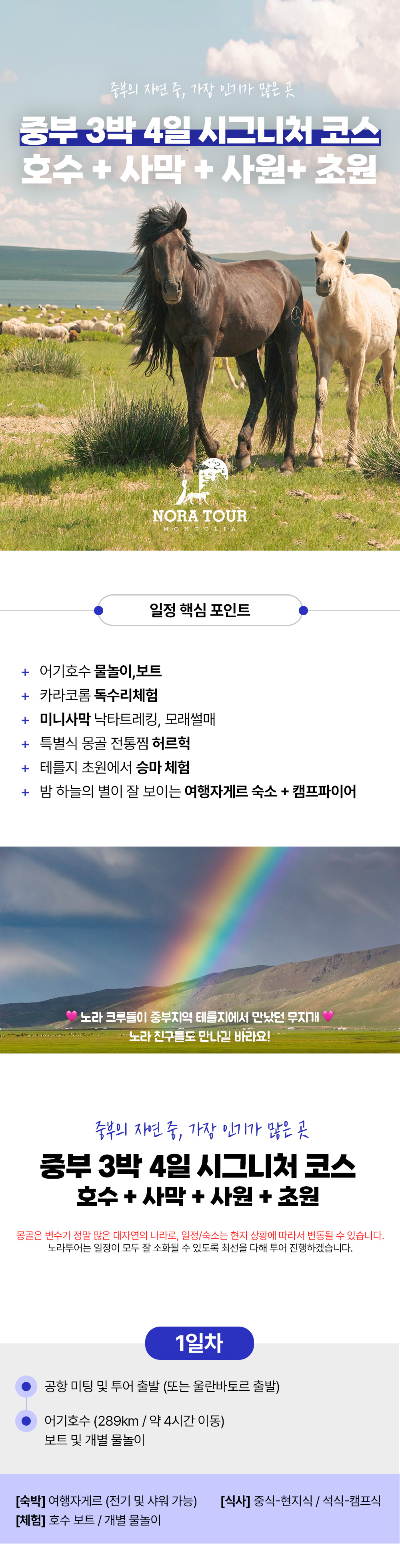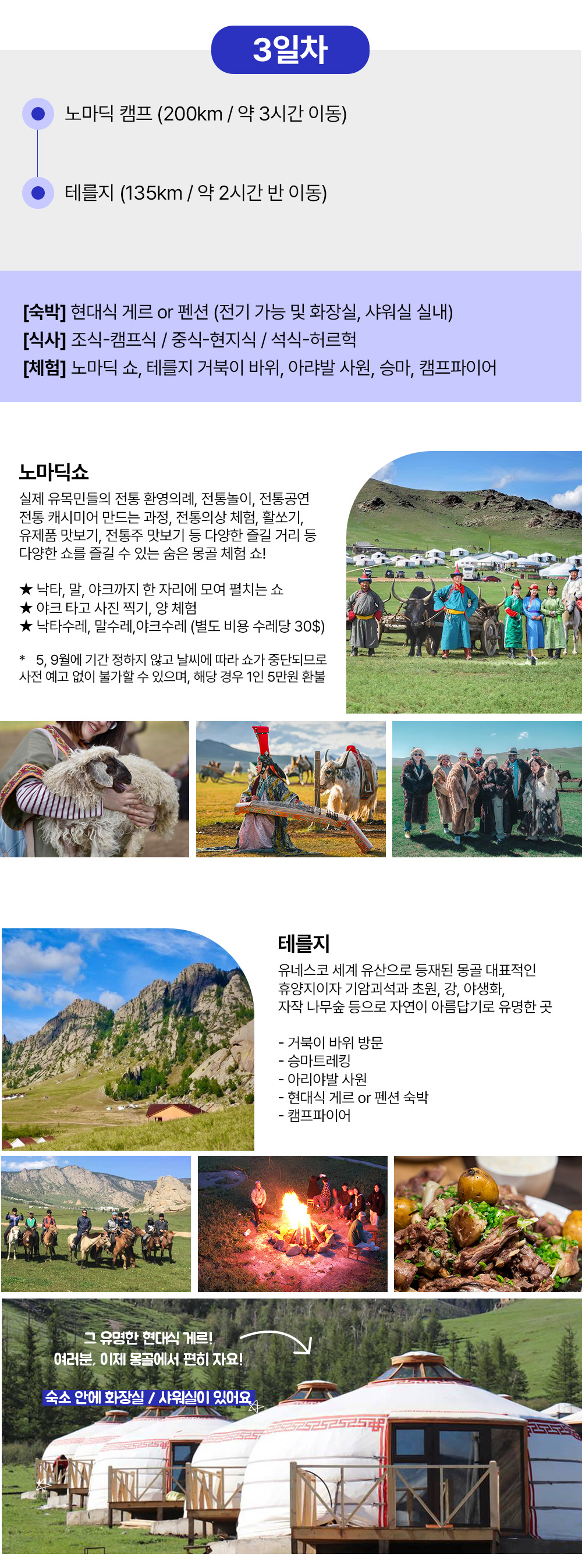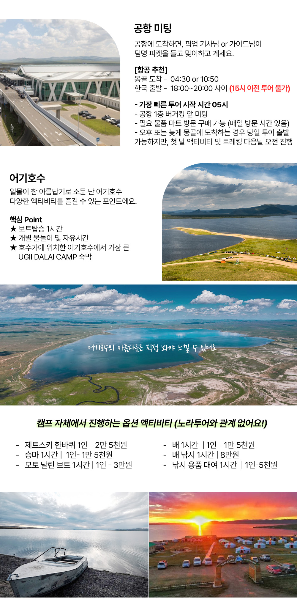 [1day] 어기호수 물놀이, 보트 (여행자게르) [2day] 13세기 옛수도 카라코롬, 독수리체험, 에르덴조 사원 미니사막 낙타타고 모래썰매 (여행자게르) [3day] 노마딕 쇼 몽골 증류주 맛보기, 야크 타기 등등 다양한 즐길거리 테를지 국립공원에서 승마, 거북이 바위, 아랴발 사원, 캠프파이어 (현대식 게르) [4day] 투어종료