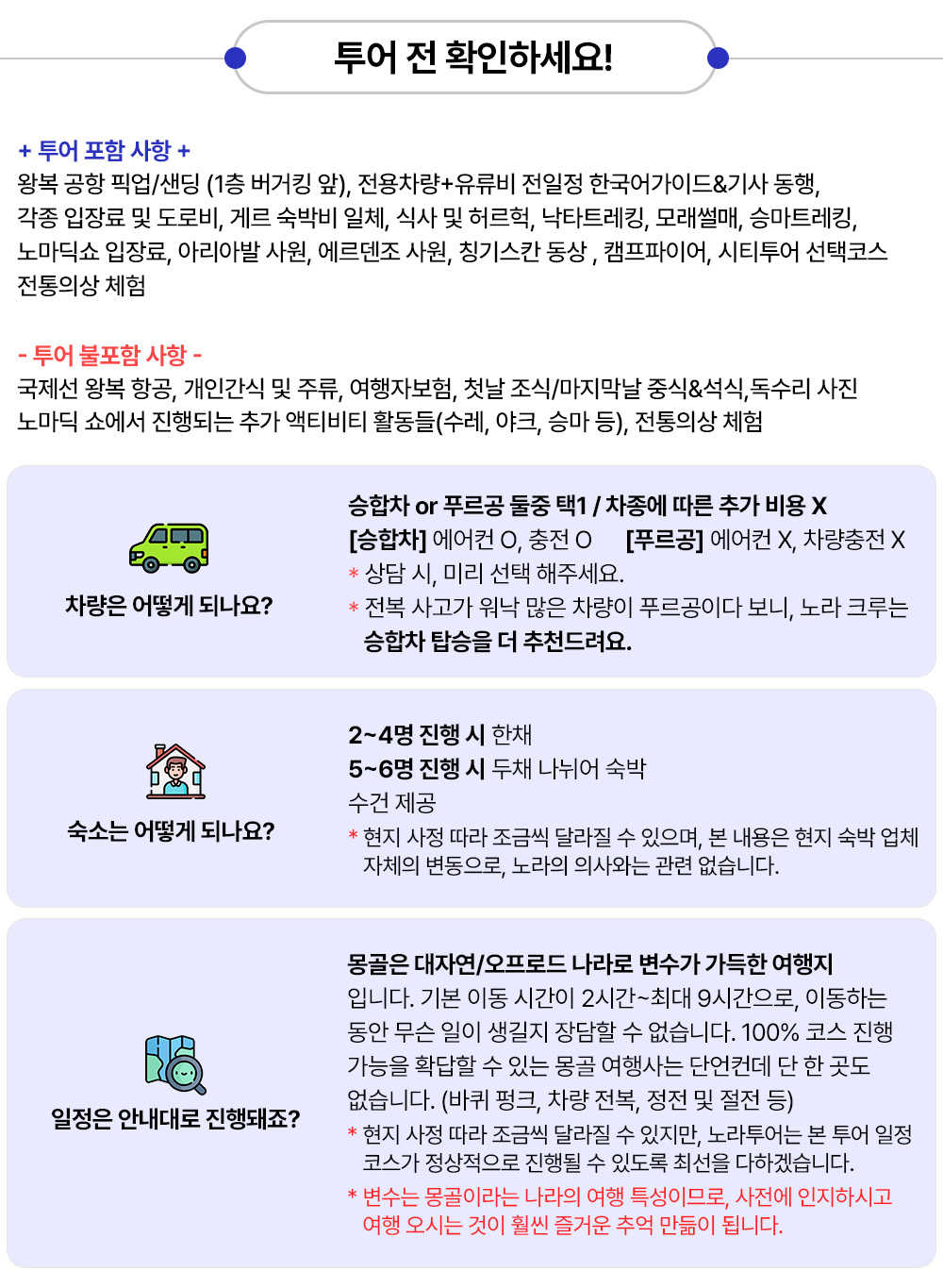 - 차량 이동 시 안전 벨트 꼭 착용하여 주시고 자리에서 일어나지 않습니다. - 휴대폰 및 귀중품(현금)은 개별 소지하시고 숙소나 식당 등에 두고 자리를 떠나는 일 없게 합니다. - 투어일정(숙소 및 순서)은 여행객의 안전을 위하여 천재지변이나 악천후 등 현지 사정으로 변동될 수 있음을 알려드립니다. - 가이드 인솔에 협조하지 않아 난 사고에 대해서는 여행사가 도움 드리기 어렵습니다. - 승마 및 낙타 체험 시 동물을 놀래킬 수 있는 행위(뒤에 서 있기, 소리 지르기, 말 위에서 옷 갈아입기, 셀카봉 들고 타기, 사진촬영)등을 삼가시기 바라며, 손잡이를 꼭 잡고 마부의 지시에 따르도록 합니다. - 체험활동 시 발생할 수 있는 사고(승마, 낙타)에 대해 주의사항 충분히 숙지한 후 동의서 작성하여 활동에 참여하게 됩니다. - 여행자 보험에 가입 후 투어에 참여해주시길 바라며 특약사항(말/낙타 등 체험 시 보상) 추가하시는 것을 추천 드립니다. 본 상품은 여행자보험 불포함 상품입니다. - 어린이 요금은 성인과 동일하게 적용됩니다