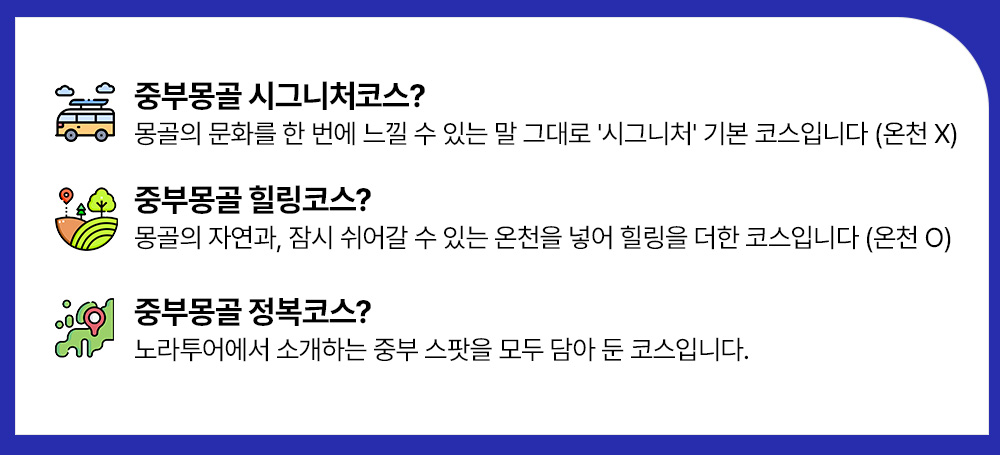 초원 지역 코스에 '온천'을 더한 힐링코스입니다. 토탈 투어비용에서 실제 결제는 예약금(1인 5만원)만 진행합니다. 잔금은 현지에서 '한화'로 지불해주세요.