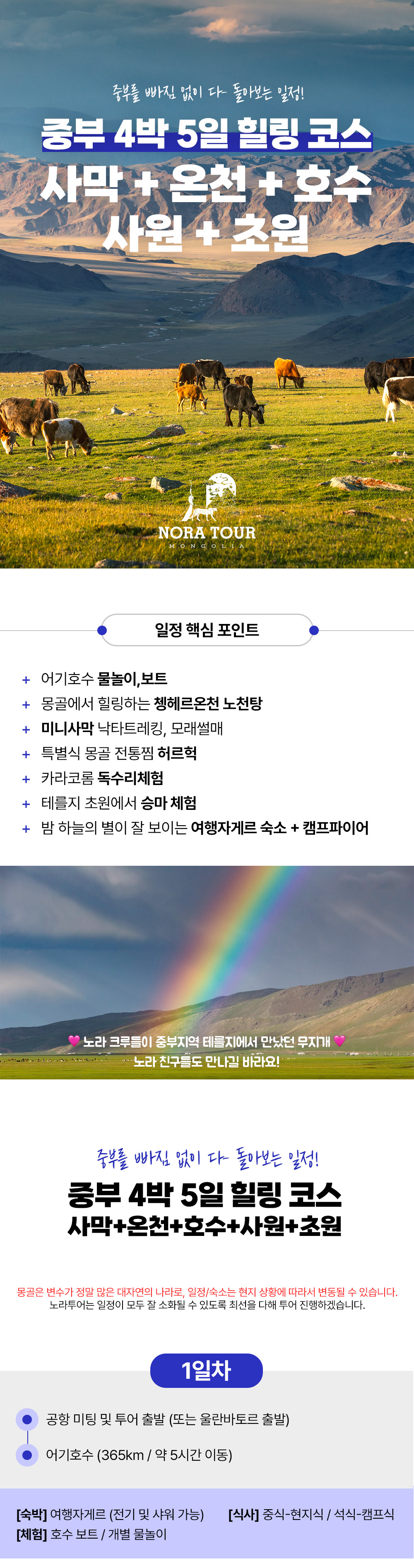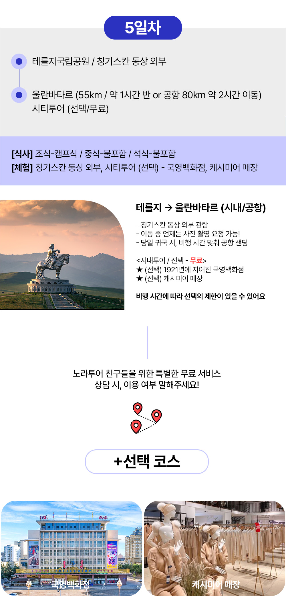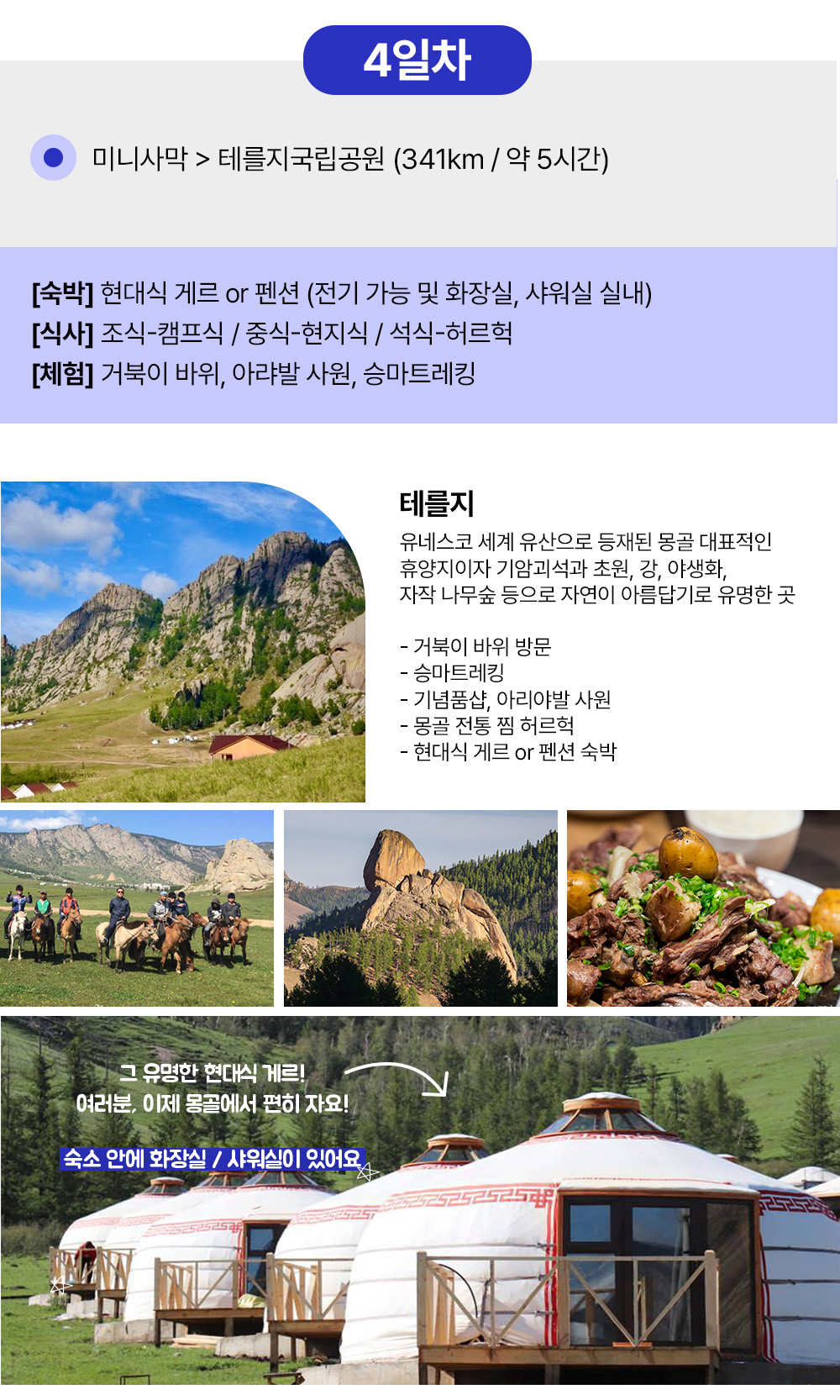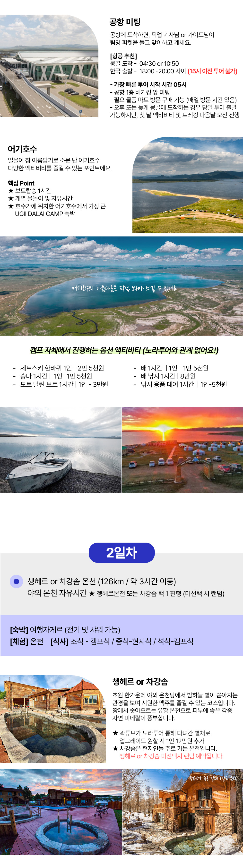 [1day] 어기호수 물놀이, 보트 (여행자게르) [2day] 쳉헤르 온천 노천탕 (여행자게르) [3day] 13세기 옛수도 카라코롬 독수리체험 미니사막에서 낙타타고 모래썰매 (여행자게르) [4day] 테를지 국립공원 승마, 거북이 바위, 기념품샵, 아랴발 사원 (현대식 게르) [5day] 칭기스칸 동상 울란바타르도착 선택코스 or 공항 샌딩