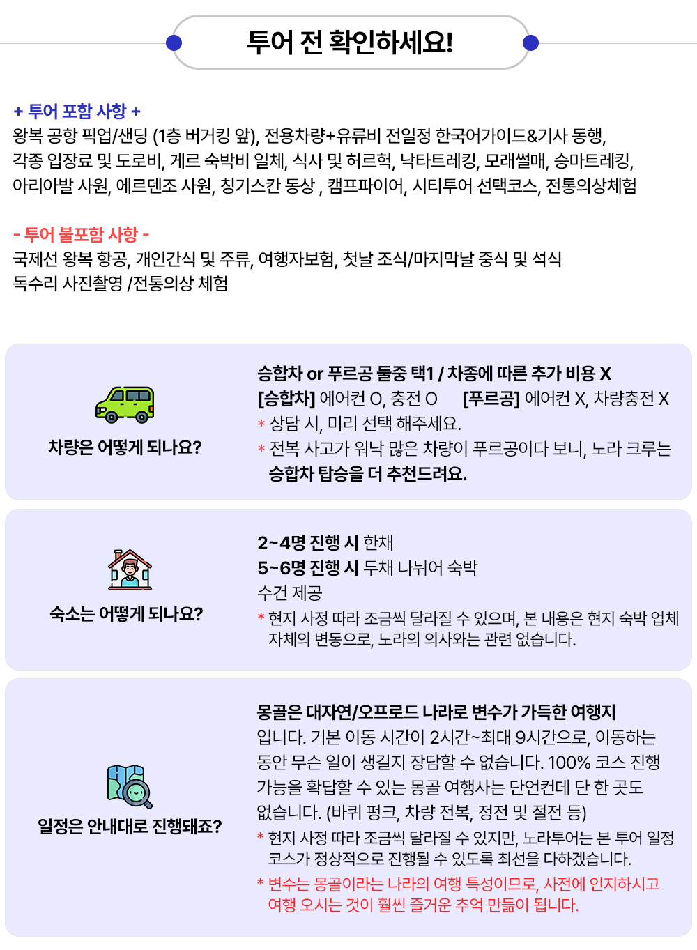 - 차량 이동 시 안전 벨트 꼭 착용하여 주시고 자리에서 일어나지 않습니다. - 휴대폰 및 귀중품(현금)은 개별 소지하시고 숙소나 식당 등에 두고 자리를 떠나는 일 없게 합니다. - 투어일정(숙소 및 순서)은 여행객의 안전을 위하여 천재지변이나 악천후 등 현지 사정으로 변동될 수 있음을 알려드립니다. - 가이드 인솔에 협조하지 않아 난 사고에 대해서는 여행사가 도움 드리기 어렵습니다. - 승마 및 낙타 체험 시 동물을 놀래킬 수 있는 행위(뒤에 서 있기, 소리 지르기, 말 위에서 옷 갈아입기, 셀카봉 들고 타기, 사진촬영)등을 삼가시기 바라며, 손잡이를 꼭 잡고 마부의 지시에 따르도록 합니다. - 체험활동 시 발생할 수 있는 사고(승마, 낙타)에 대해 주의사항 충분히 숙지한 후 동의서 작성하여 활동에 참여하게 됩니다. - 여행자 보험에 가입 후 투어에 참여해주시길 바라며 특약사항(말/낙타 등 체험 시 보상) 추가하시는 것을 추천 드립니다. 본 상품은 여행자보험 불포함 상품입니다. - 어린이 요금은 성인과 동일하게 적용됩니다