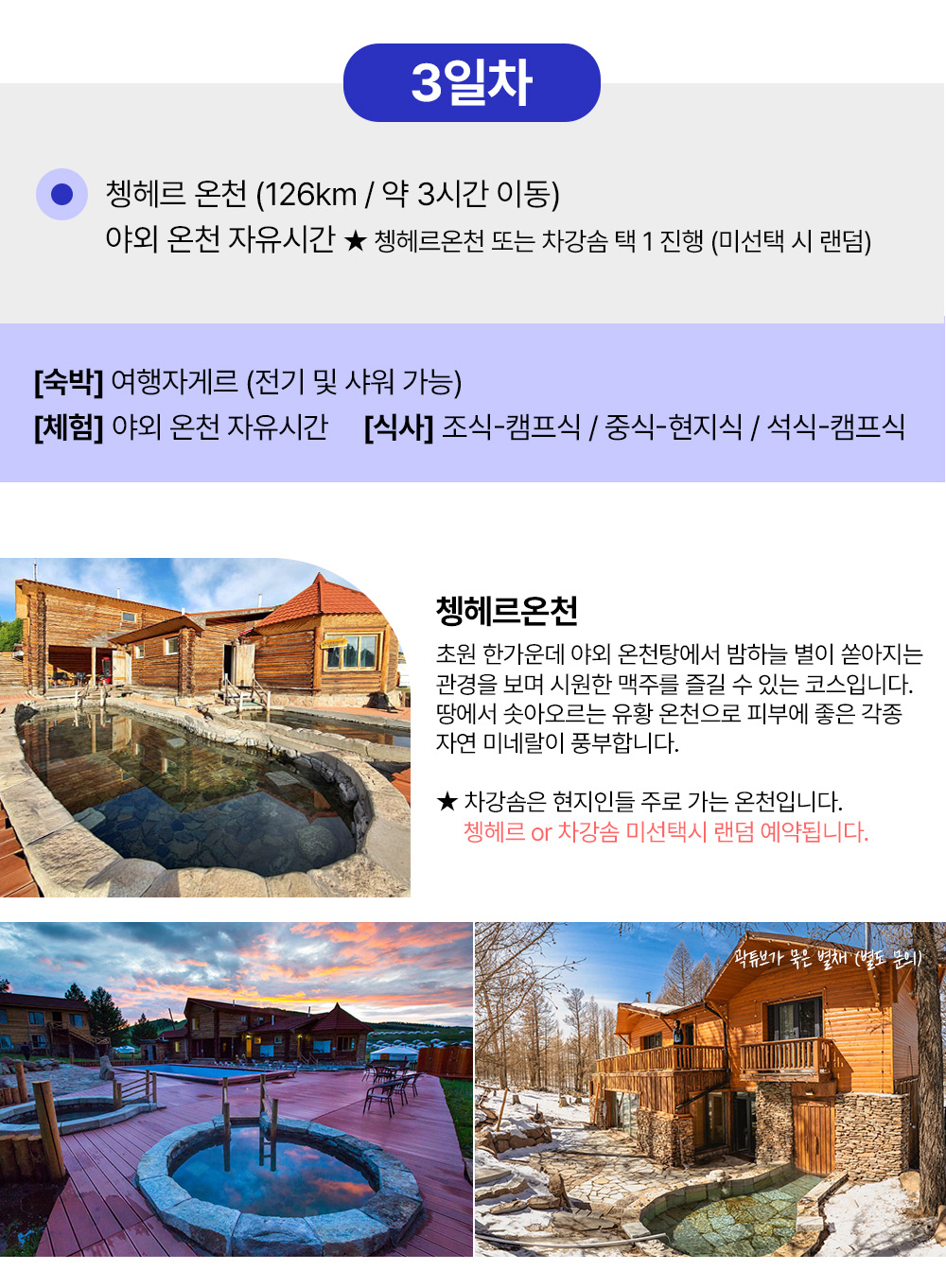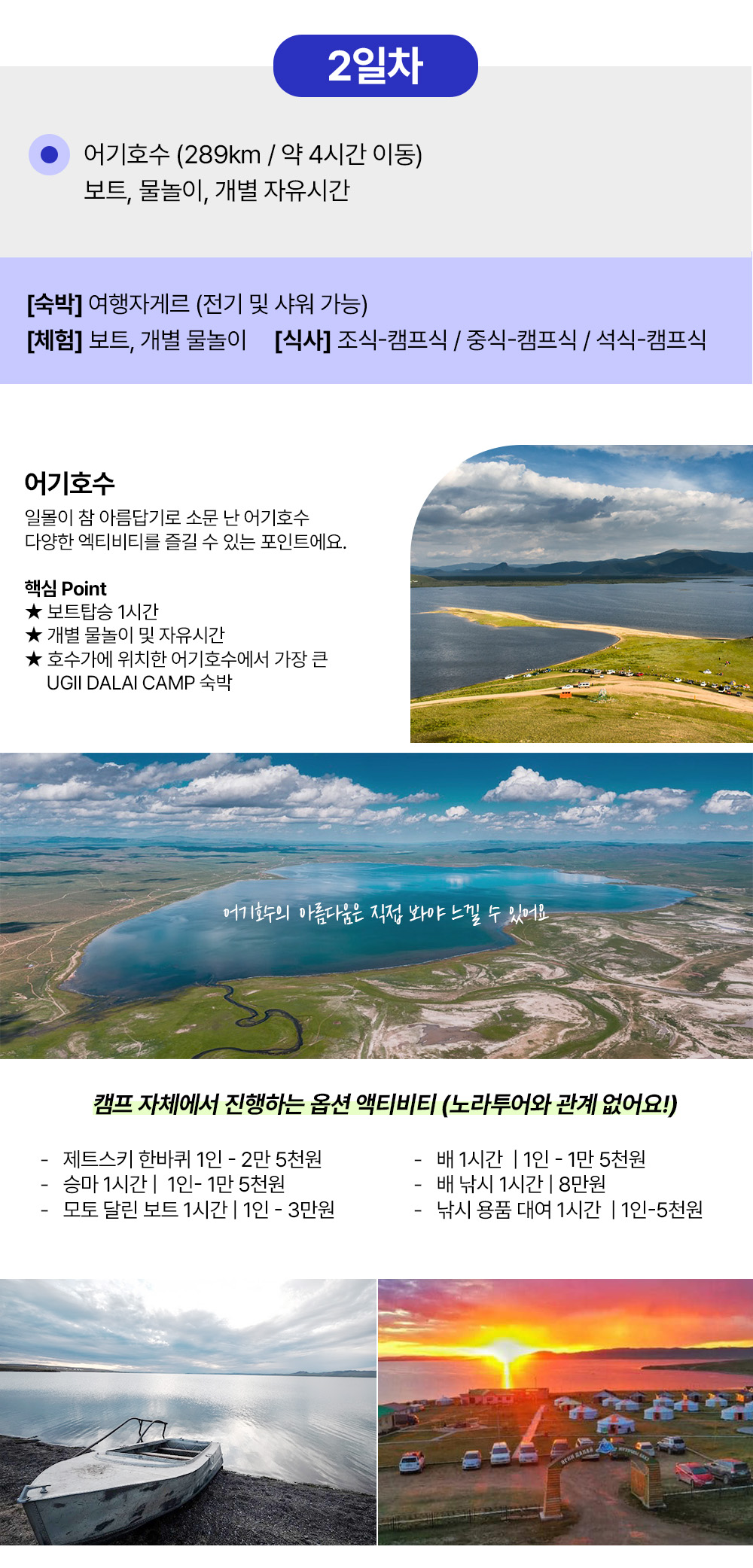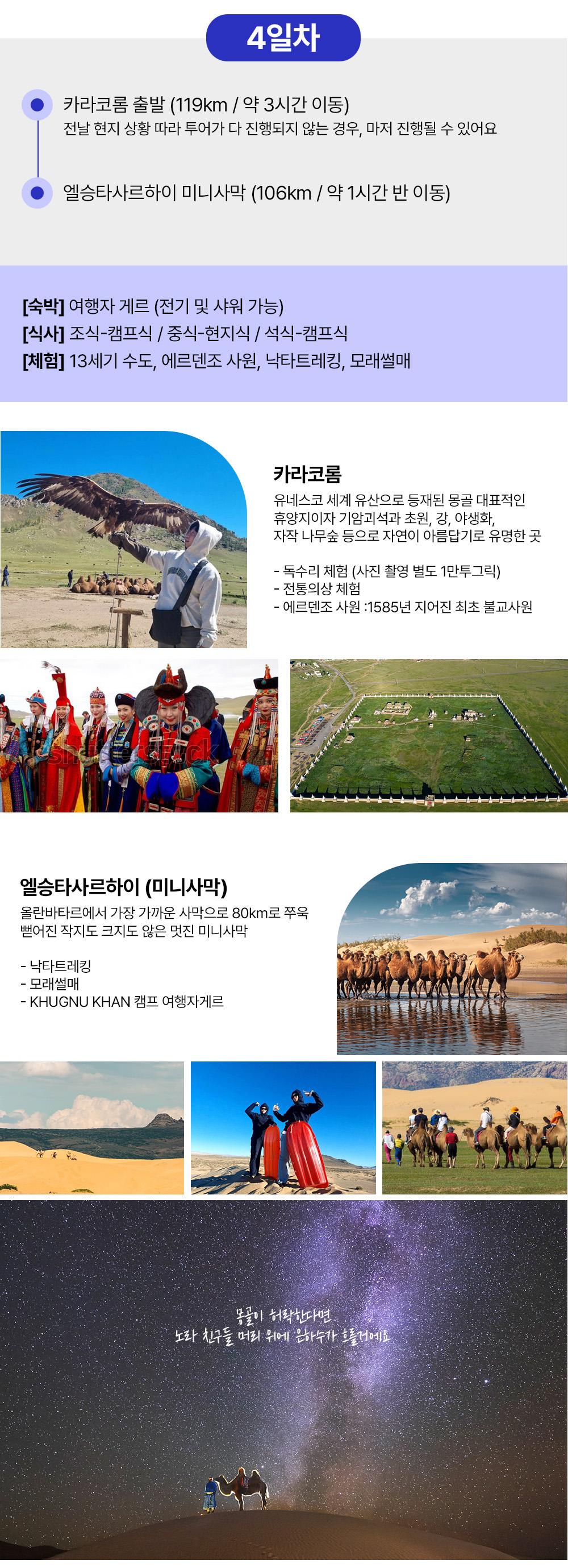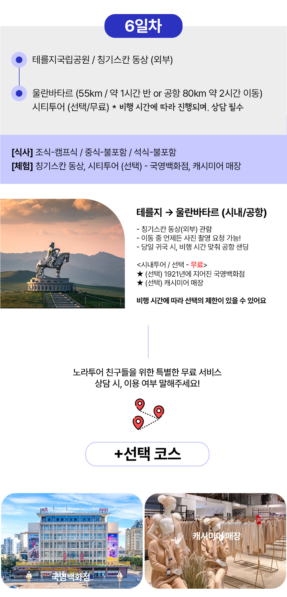 [1day] 흔히 볼 수 없는 전통 문화 체험 노마딕 쇼, 몽골 증류주 맛보기, 야크 타기 등등 다양한 즐길거리 (여행자게르) [2day] 어기호수 물놀이, 보트 (여행자게르) [3day] 쳉헤르 온천 노천탕 (여행자게르) [4day] 13세기 옛수도 카라코롬 독수리체험 미니사막에서 낙타타고 모래썰매 (여행자게르) [5day] 테를지 국립공원 승마, 거북이 바위, 기념품샵, 아랴발 사원 (현대식 게르) [6day] 칭기스칸 동상 울란바타르도착 선택코스 or 공항 샌딩