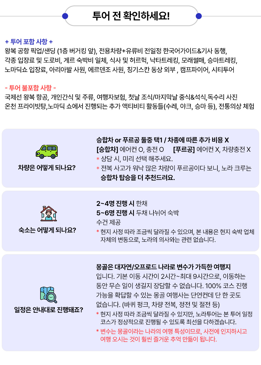- 차량 이동 시 안전 벨트 꼭 착용하여 주시고 자리에서 일어나지 않습니다. - 휴대폰 및 귀중품(현금)은 개별 소지하시고 숙소나 식당 등에 두고 자리를 떠나는 일 없게 합니다. - 투어일정(숙소 및 순서)은 여행객의 안전을 위하여 천재지변이나 악천후 등 현지 사정으로 변동될 수 있음을 알려드립니다. - 가이드 인솔에 협조하지 않아 난 사고에 대해서는 여행사가 도움 드리기 어렵습니다. - 승마 및 낙타 체험 시 동물을 놀래킬 수 있는 행위(뒤에 서 있기, 소리 지르기, 말 위에서 옷 갈아입기, 셀카봉 들고 타기, 사진촬영)등을 삼가시기 바라며, 손잡이를 꼭 잡고 마부의 지시에 따르도록 합니다. - 체험활동 시 발생할 수 있는 사고(승마, 낙타)에 대해 주의사항 충분히 숙지한 후 동의서 작성하여 활동에 참여하게 됩니다. - 여행자 보험에 가입 후 투어에 참여해주시길 바라며 특약사항(말/낙타 등 체험 시 보상) 추가하시는 것을 추천 드립니다. 본 상품은 여행자보험 불포함 상품입니다. - 어린이 요금은 성인과 동일하게 적용됩니다