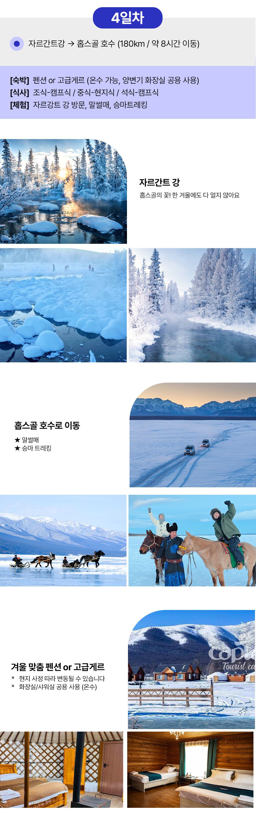 [4day] 자르간트 강 인생샷, 홉스골 호수, 말썰매, 승마, 캠프파이어 180km 8시간 (고급 펜션 or 고급게르)