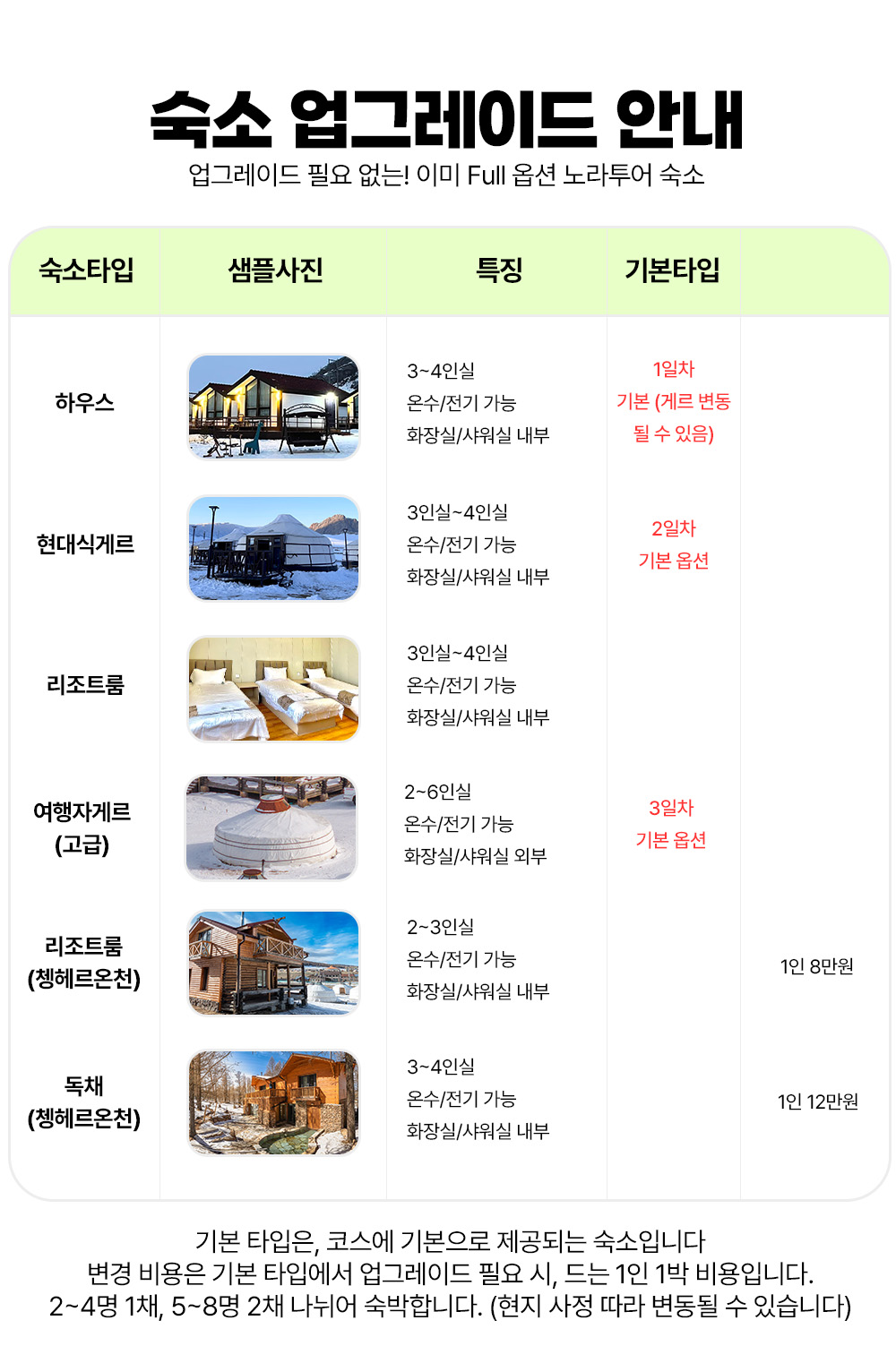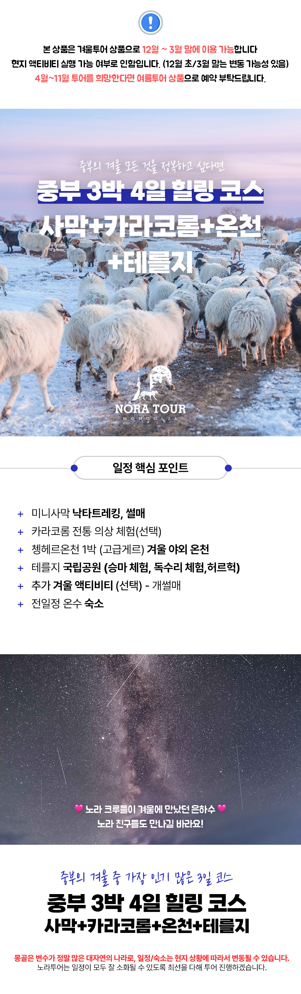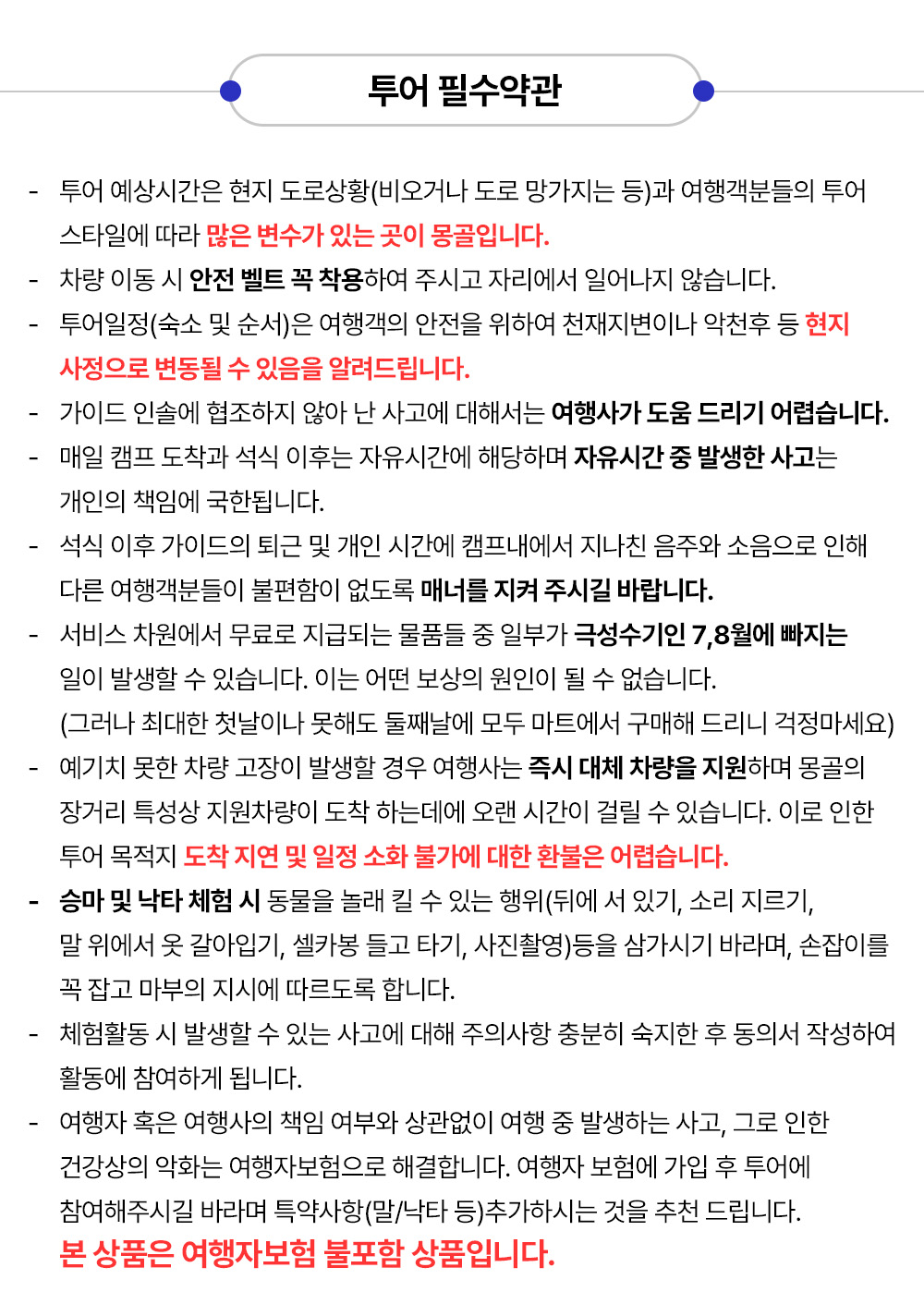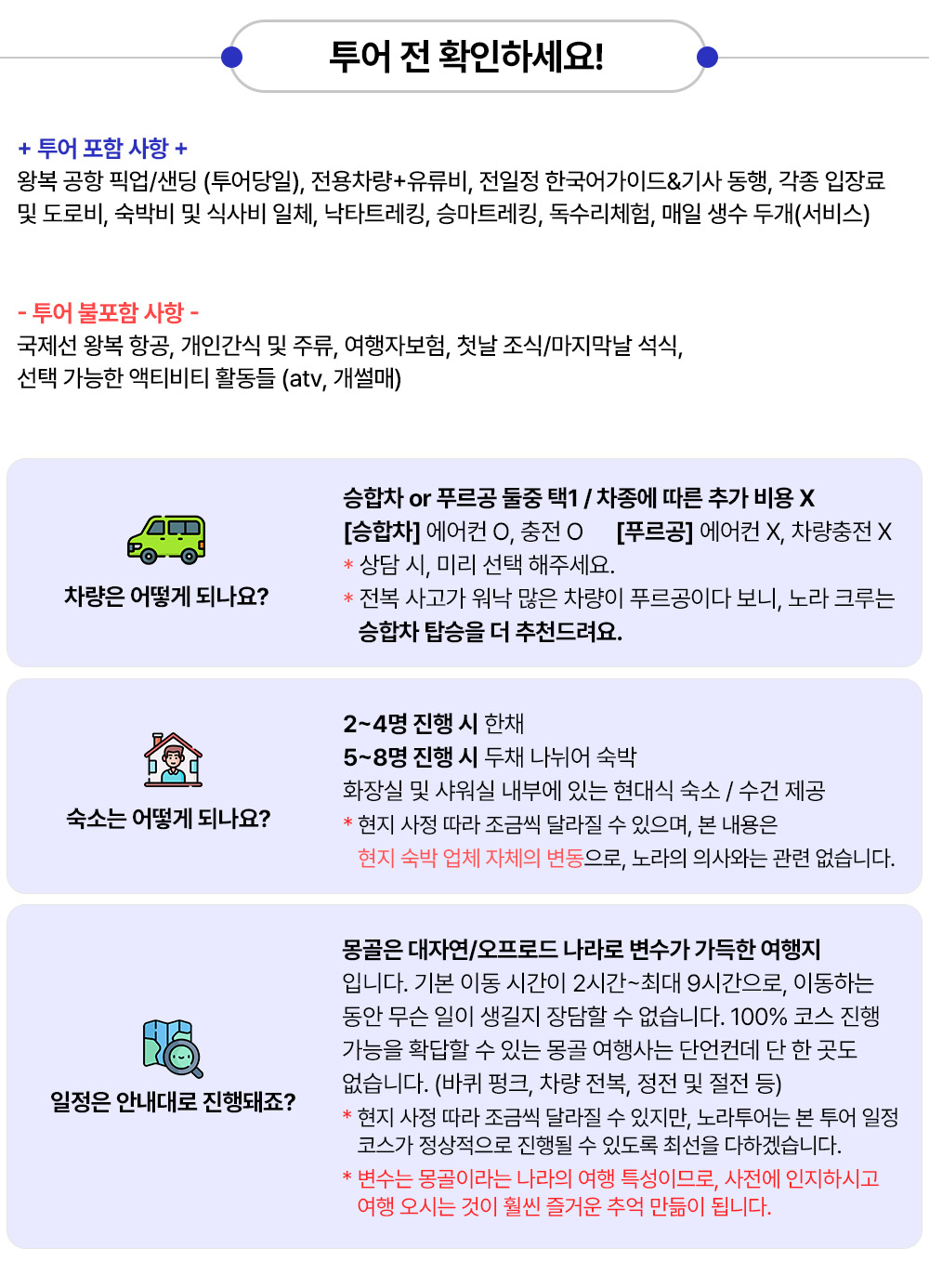 [필수 약관] -이동 예상시간은 현지 도로상황(비오거나 도로 망가지는 등)과 여행객분들의 투어 스타일에 따라 많은 변수가 있습니다. -차량 이동 시 안전 벨트 꼭 착용하여 주시고 자리에서 일어나지 않습니다. -휴대폰 및 귀중품은 개별 소지하시고 숙소나 식당 등에 두고 자리를 떠나는 일 없게 합니다. 분실시 책임지지 않습니다. -투어일정(숙소 및 순서)은 여행객의 안전을 위하여 천재지변이나 악천후 등 현지 사정으로 변동될 수 있음을 알려드립니다. -가이드 인솔에 협조하지 않아 난 사고에 대해서는 여행사가 도움 드리기 어렵습니다. - 개인 물건은 항시 본인이 챙겨야 합니다. 분실/파손 시 노라투어가 책임지지 않습니다. -매일 캠프 도착과 석식 이후는 자유시간에 해당하며 자유시간 중 발생한 사고는 개인의 책임에 국한됩니다. -석식 이후 가이드의 퇴근 및 개인 시간과 캠프내에서 지나친 음주와 소음으로 인해 다른 여행객분들이 불편함이 없도록 매너를 지켜 주시길 바랍니다. -하루에도 수십팀의 투어 준비물 챙기고 나가는 과정에서 서비스 차원에서 무료로 지급되는 물품들 중 일부가 빠지는 일이 간혹 발생할 수 있습니다(극히 드문 일). 이는 어떤 보상의 원인이 될 수 없습니다. (그러나 최대한 첫날이나 못해도 둘째날에 모두 마트에서 구매해 드리니 걱정마세요) -예기치 못한 차량 고장이 발생할 경우 여행사는 즉시 대체차량을 지원하며 몽골의 장거리 특성상 지원차량이 도착 하는데에 오랜 시간이 걸릴 수 있습니다. 이로 인한 투어 목적지 도착 지연 및 일정 소화 불가에 대한 환불은 어렵습니다. -승마 및 낙타 체험 시 동물을 놀래 킬 수 있는 행위(뒤에 서 있기, 소리 지르기, 말 위에서 옷 갈아입기, 셀카봉 들고 타기, 사진촬영)등을 삼가시기 바라며, 손잡이를 꼭 잡고 마부의 지시에 따르도록 합니다. -체험활동 시 발생할 수 있는 사고에 대해 주의사항 충분히 숙지한 후 동의서 작성하여 활동에 참여하게 됩니다. -여행자 혹은 여행사 책임 여부와 상관없이 여행 중 발생할 수 있는 사고로 인한 피해 및 건강상의 악화는 여행자보험으로 해결합니다. 여행자 보험에 필수 가입 후 투어에 참여해주시길 바라며 특약사항(말/낙타/atv/말썰매/개썰매/얼음썰매/눈썰매 등 액티비티 활동 체험 시 보상) 추가하시는 것을 추천 드립니다. 본 상품은 여행자보험 불포함 상품입니다. - 어린이 요금은 성인과 동일하게 적용됩니다