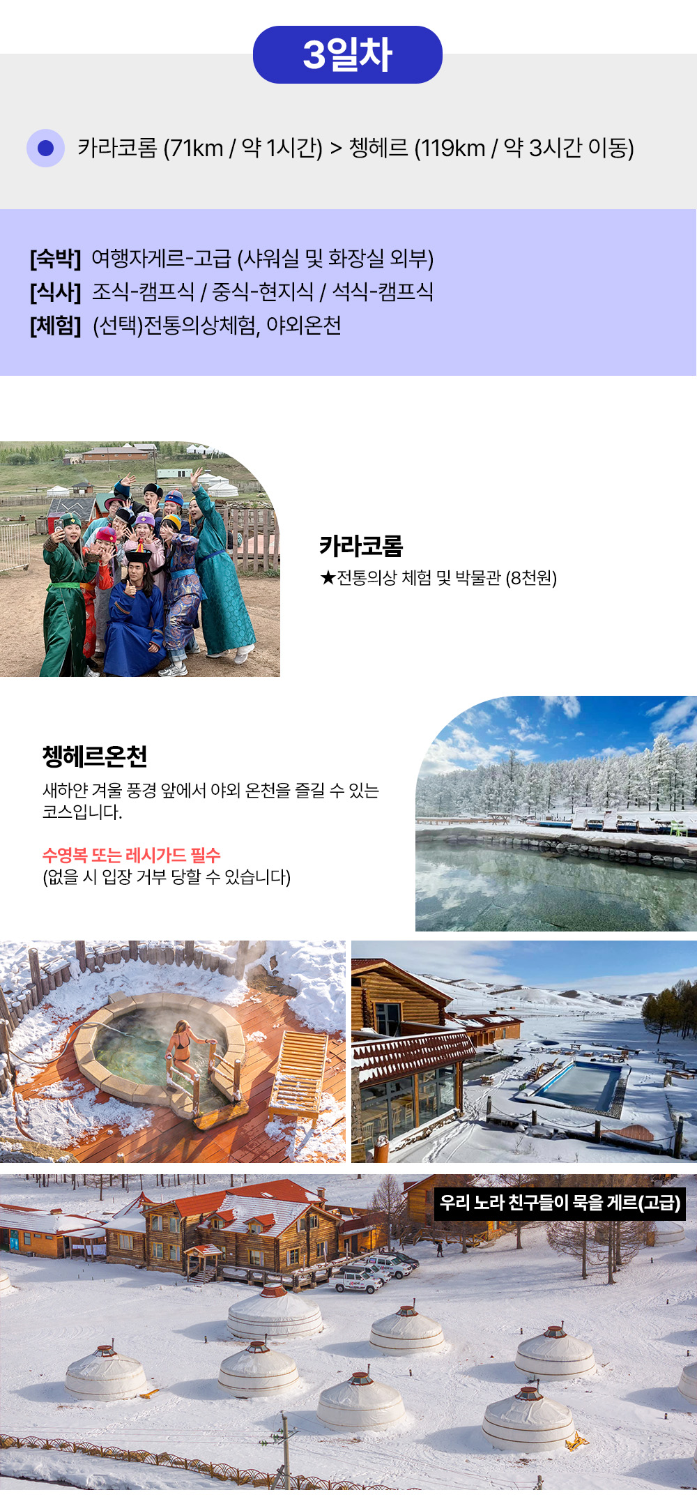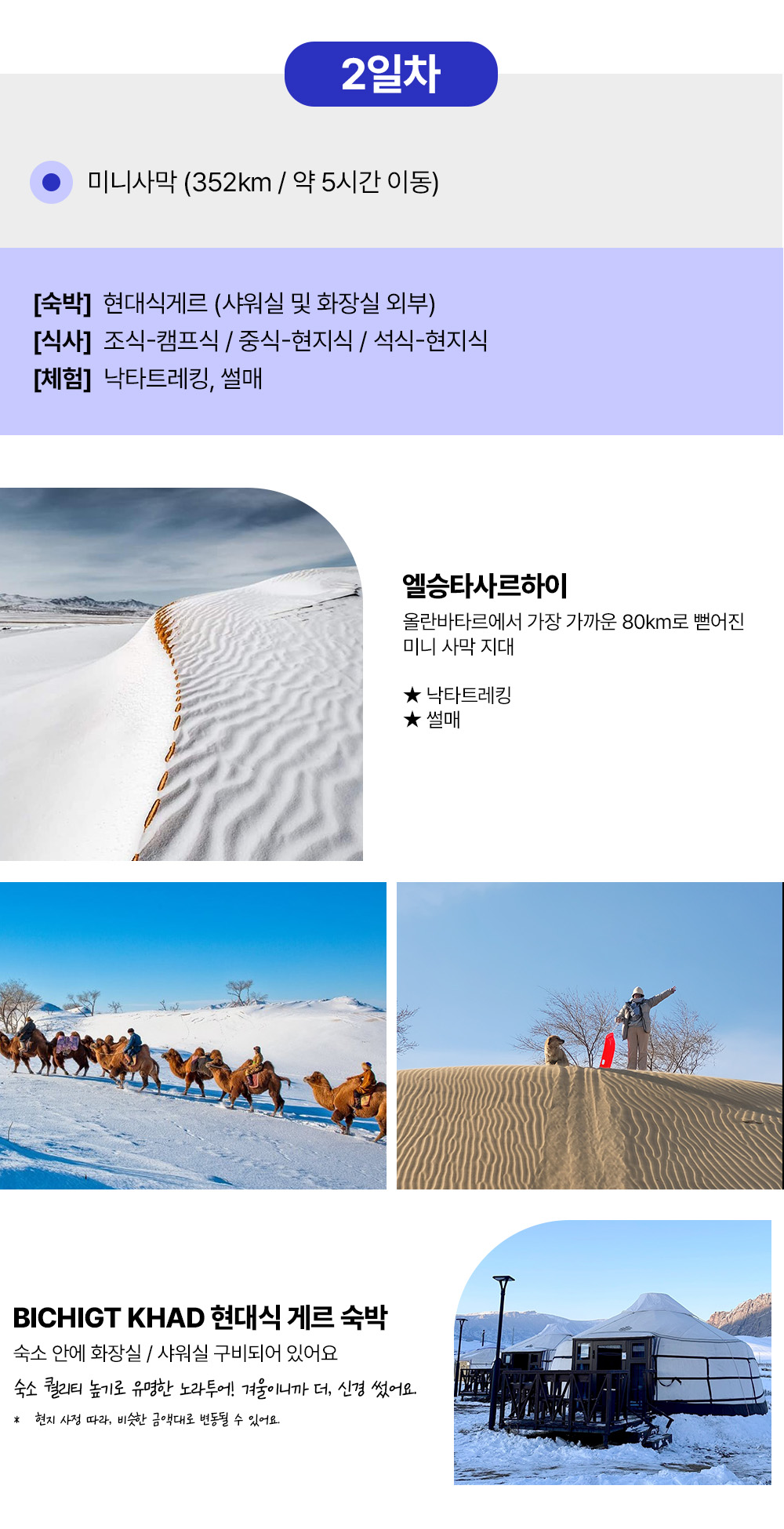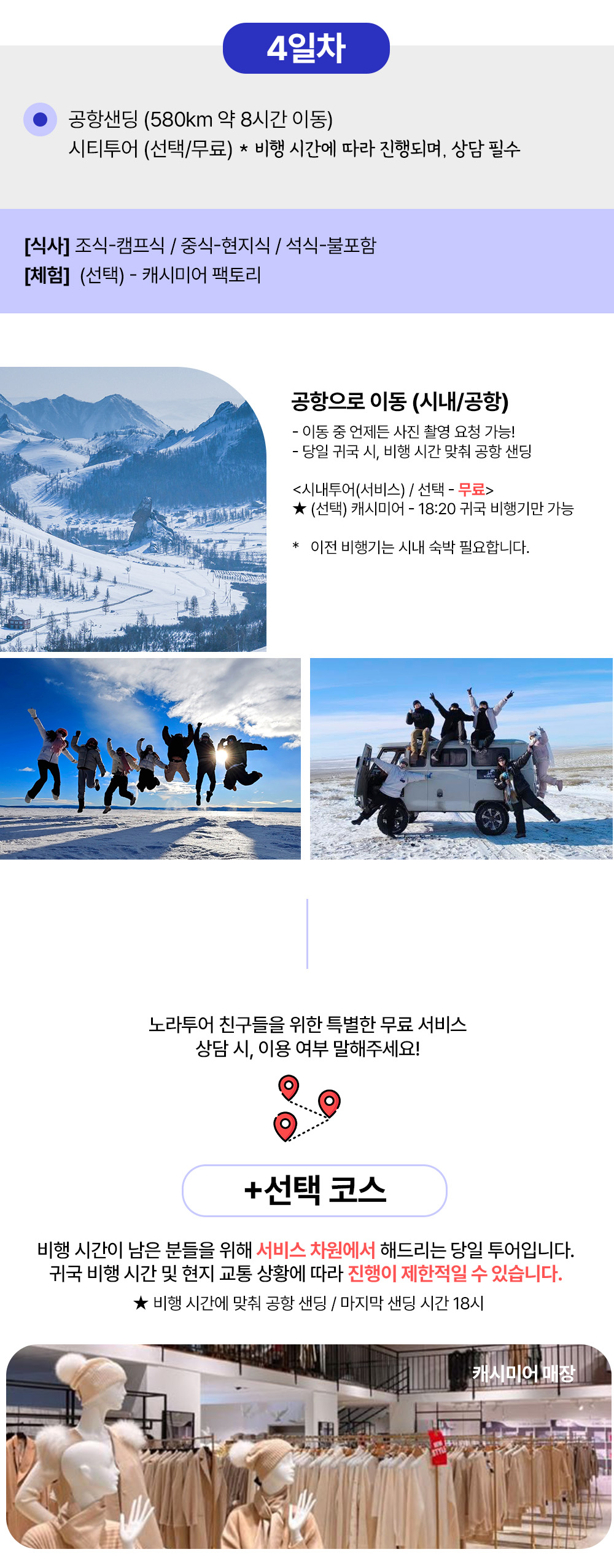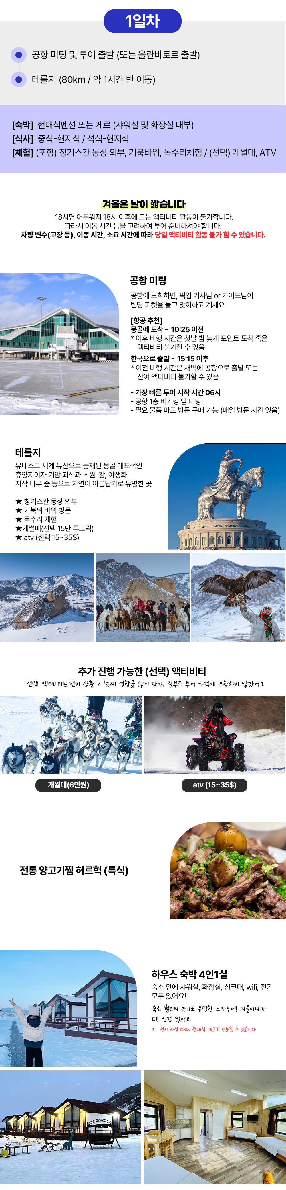 [1day] 칭기스칸 동상 외부, 테를지 승마트레킹, 독수리체험, 허르헉 (선택)개썰매 80km 1 시간반 (현대식게르) [2day] 미니사막 낙타트레킹, 모래 썰매(선택)마사지 325km 5 시간 (현대식게르) [3day] 카라코롬 (선택)전통의상체험 -> 야외 온천 208km 4 시간 (여행자고급게르) [4day] (선택)캐시미어 팩토리, 공항 샌딩 55km 2 시간